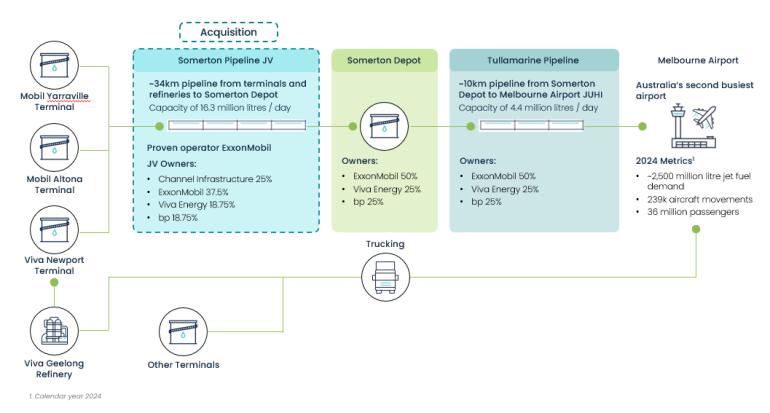 Channel owns a 25% share in the Somerton jet fuel pipeline that supplies jet fuel to Melbourne Airport , with the other joint venture partners being ExxonMobil, bp, and Viva Energy. The pipeline is operated by ExxonMobil.